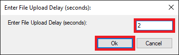 2. Enter the length of time (in seconds) to delay the tool from attempting to repost and click the ‘Ok’ button. We recommend initially setting the file upload delay between 1 to 3 seconds and incrementing the time until the tool is able to successfully repost the document in FileTrac.