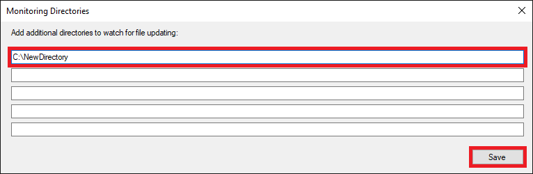 2. Type in the location of the new directory, up to 5 new directories, that you want the tool to monitor and click the ‘Save’ button. Then, press the ‘OK’ button to close the alert informing you to restart the FileTrac Document Editor tool.