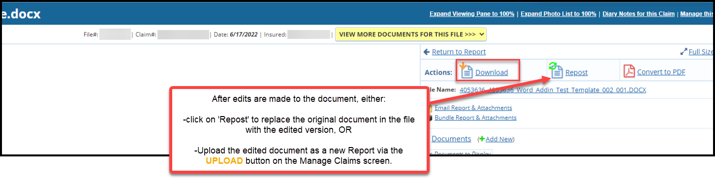 4. You can then either 'Repost' (replace) the original document or upload as a new report to the file via the UPLOAD>> button on the Manage Claims page.