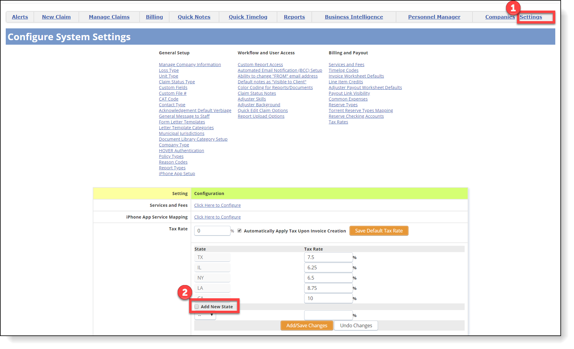 It may be necessary to set a state tax default rate if you are doing business in Texas or another state that requires taxes to be included. Sales tax is added during the creation of an invoice and is driven by the Loss Location State. FileTrac has added automation of the Sales Tax to limit errors in invoice creation.