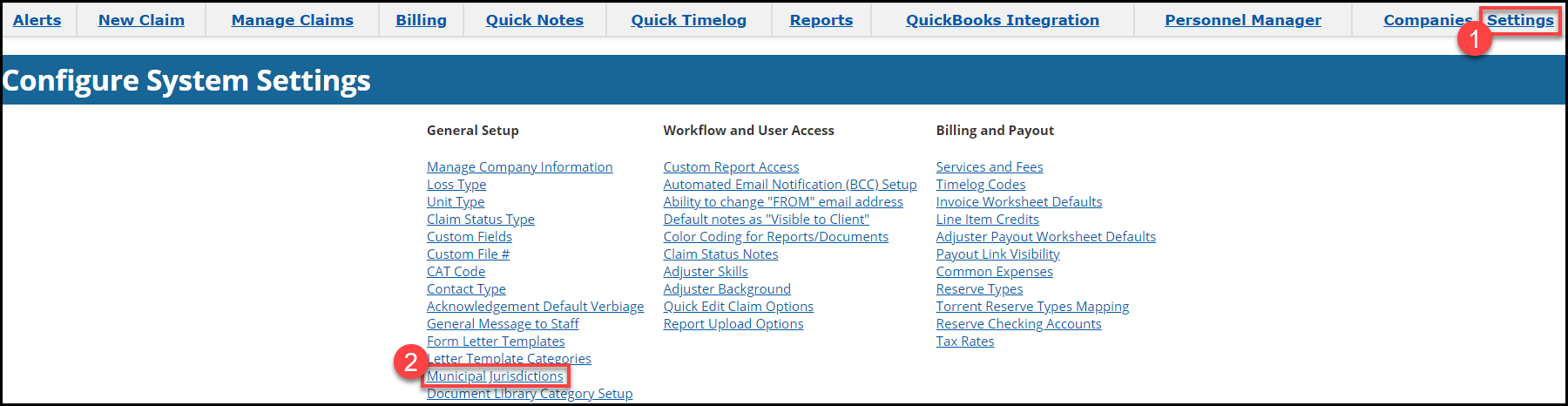 Jurisdictions can be added for the purpose of creating a Word template with the jurisdiction information. The jurisdiction information will be pulled into the Word template based on the Loss Location city of a given claim. For instructions on creating Word template documents, click the following link: