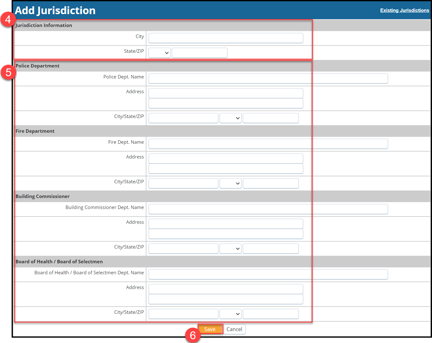 5. Then enter the information for that Jurisdiction's Police Department, Fire Department, Building Commissioner, and/or Board of Health/Board of Selectmen.
