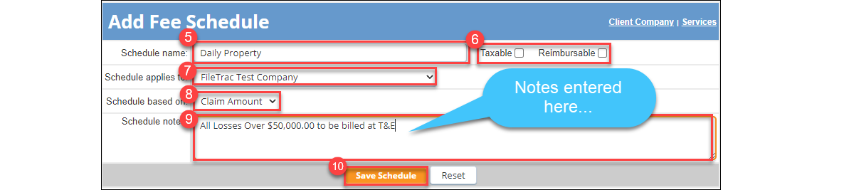 7. Be sure that the correct Company for which this fee 'Schedule Applies To' is selected from the drop-down menu