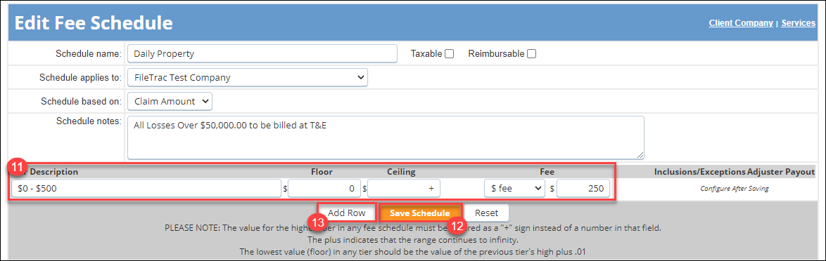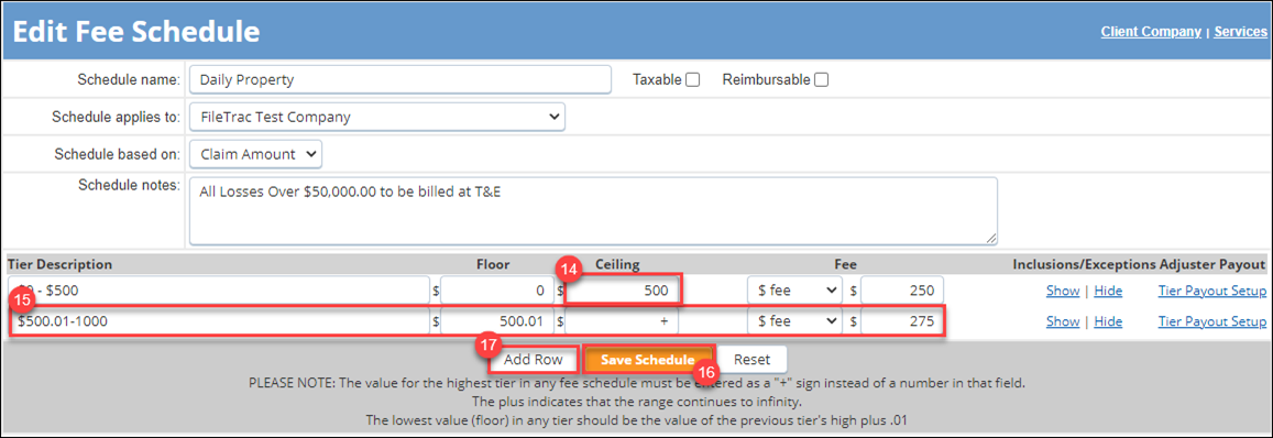 17. Click 'Add Row' (continue steps 14-17 until all Tiers have been entered). The final tier 'Ceiling' remains at “+”.