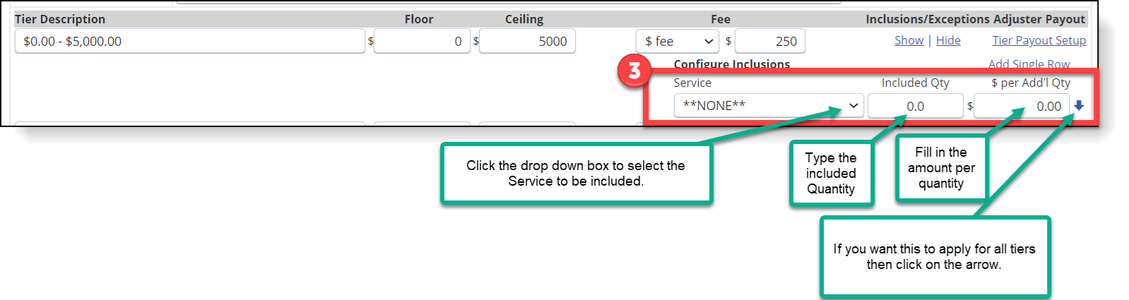 1. Click on 'Show' beneath Inclusions/Exceptions from within a tier of the fee schedule.
