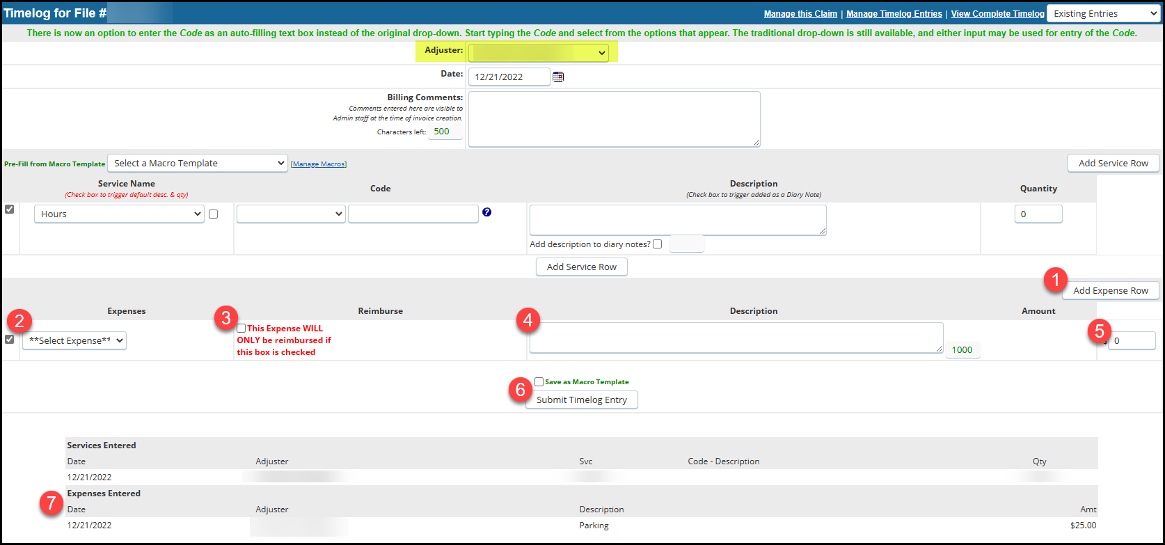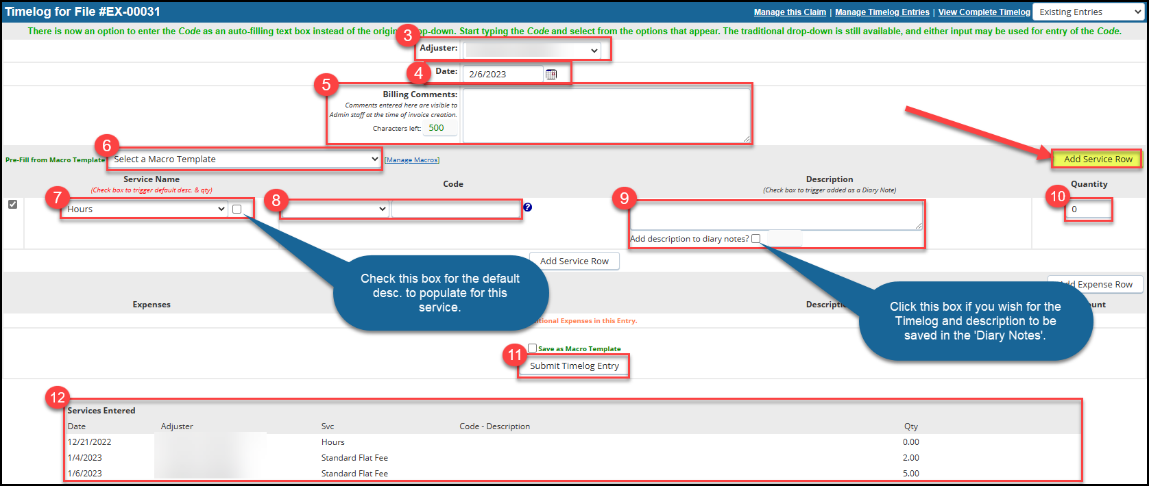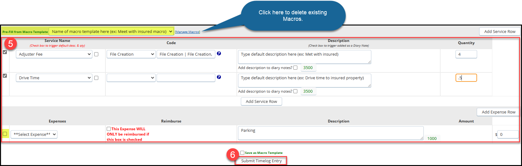 Macro templates can be created and saved for a group of services and expenses, which can help to save time and avoid errors in Timelog entries. These macros and can be saved with default descriptions and quantities and can be used on the Timelog page for any claim.