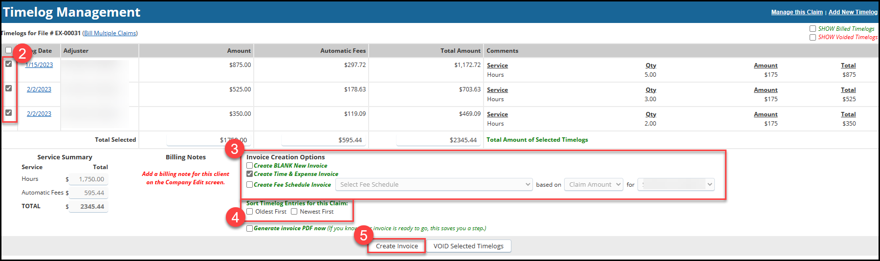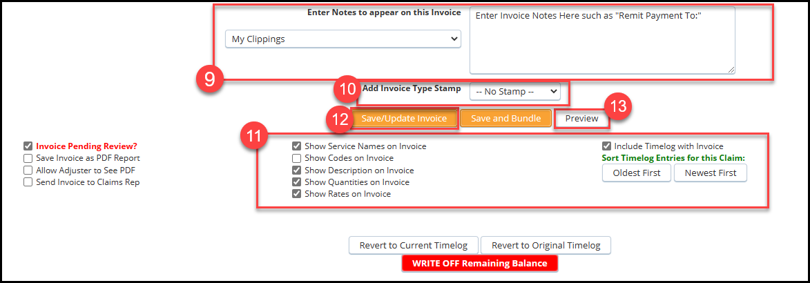 2. To save the time logs on the invoice, click the box Create Released Timelog Entries! The timelogs will be available for the next invoice you generate for this claim. If you do not check this box, any timelog entries noted on the invoice will need to be manaully re-entered.