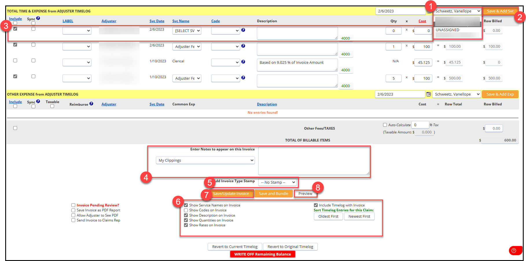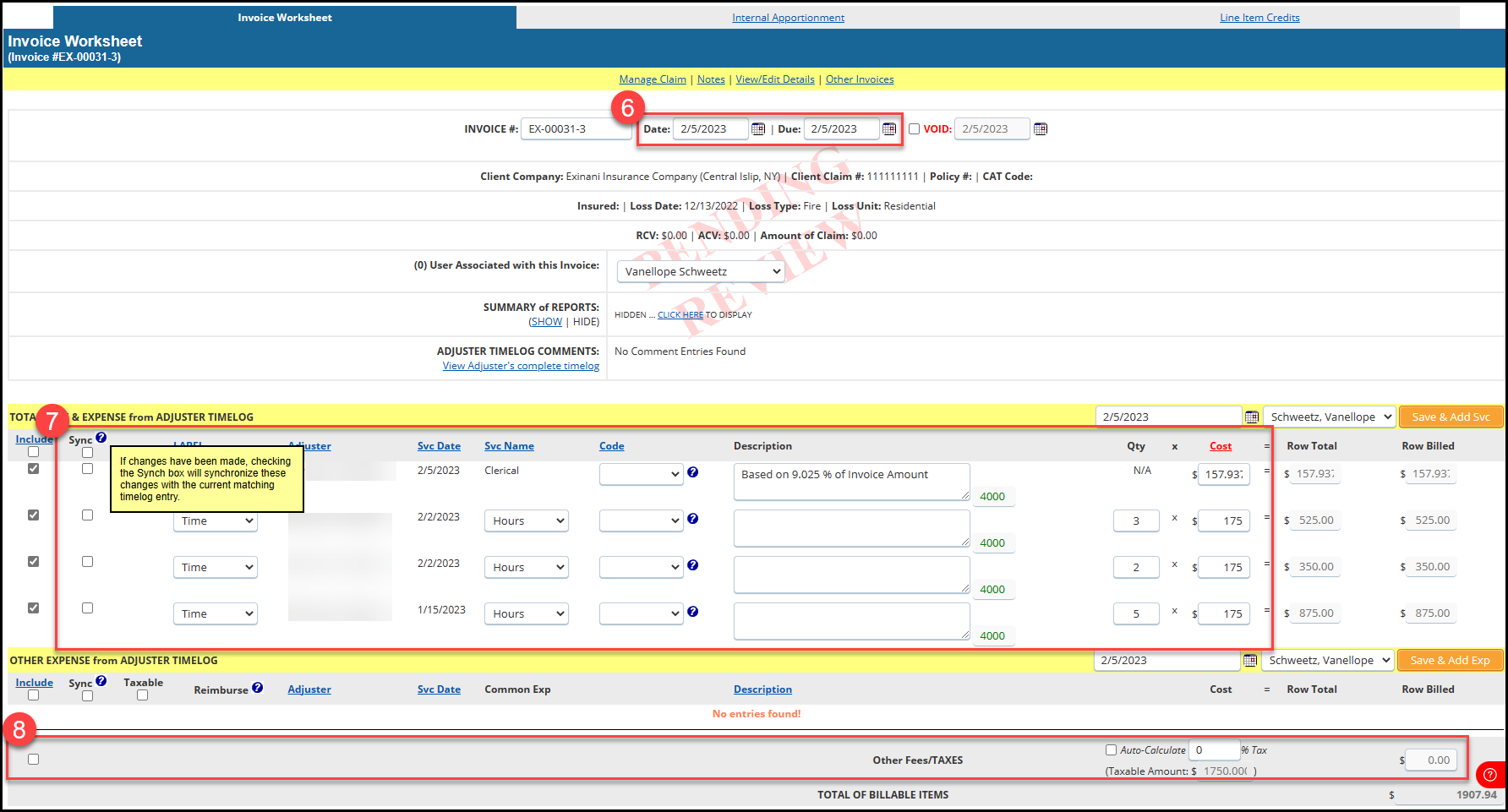 7. Review the entries and make any necessary changes to the submitted time log. If the changes made on the Invoice Worksheet need to be reflected back on the Timelog and Adjuster's payout for that item (Svc Name, Qty, Fee), mark the "Sync" box next for that line item.