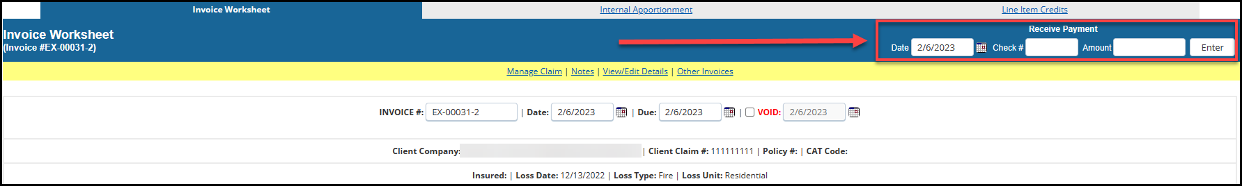 To record a payment on a single invoice via the 'Invoice Worksheet', enter the Date, Check #, and Amount of payment to be applied to invoice. Then click Enter.