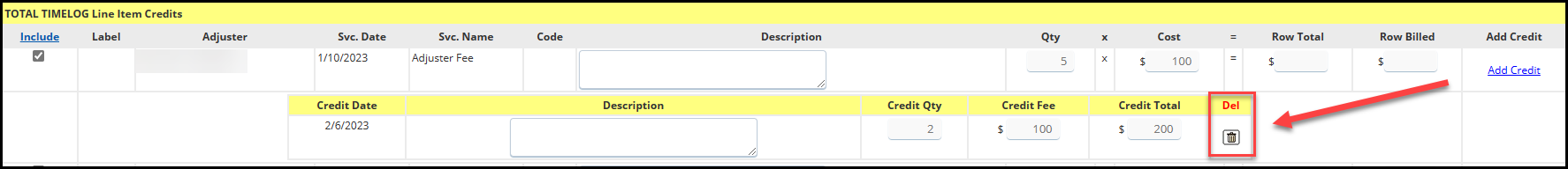The credit will then show up directly under the original entry. If you made a mistake, you have the option to delete your entry by clicking on the trash can: