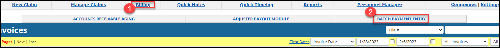 The Billing page is where the 'Accounts Receivable Aging' tab will run a report based on the dates selected that can be downloaded or printed. The 'Adjuster Payout Module' tab is where you will pay your adjusters/users. The 'Batch Payment Entry' tab, can be used to record payments received for multiple invoices.