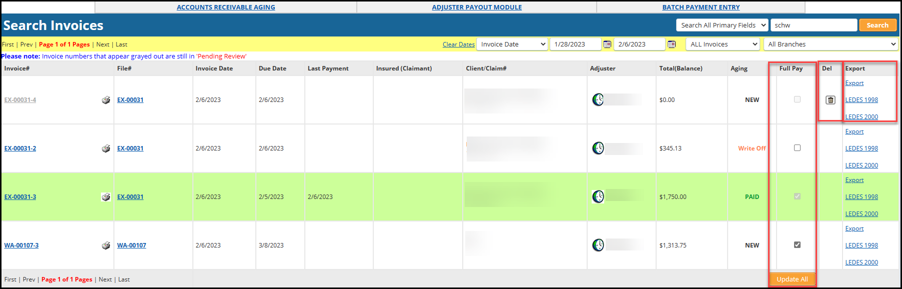 - Full Pay- Check marking the this box, allows you to quickly mark this invoice as paid from the client. You will not be given the option from this page to record a partial payment on an invoice nor enter the payment information (check #, amount). Then click Update All to mark the selected invoices as Paid.
