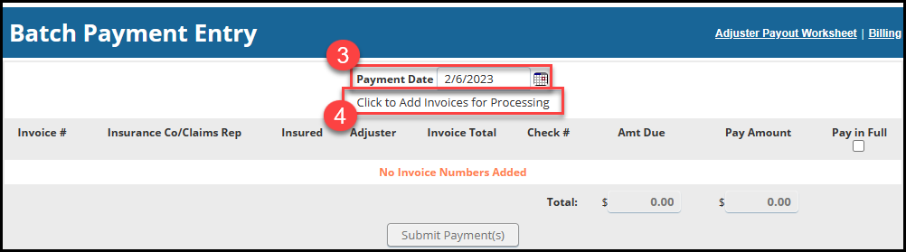 From this screen you can jump straight to the Adjuster Payout Worksheet or the Billing page. You can also add another invoice to this list by clicking the 'Click to Add Invoices for Processing' button.