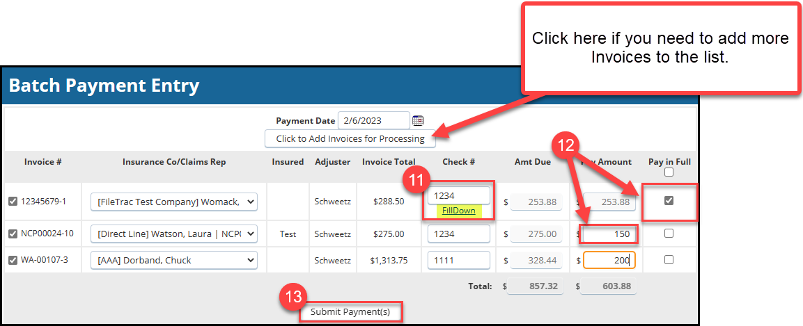 11. Enter the Check #. If all invoices on this list were paid on the same check, then click 'FillDown'.