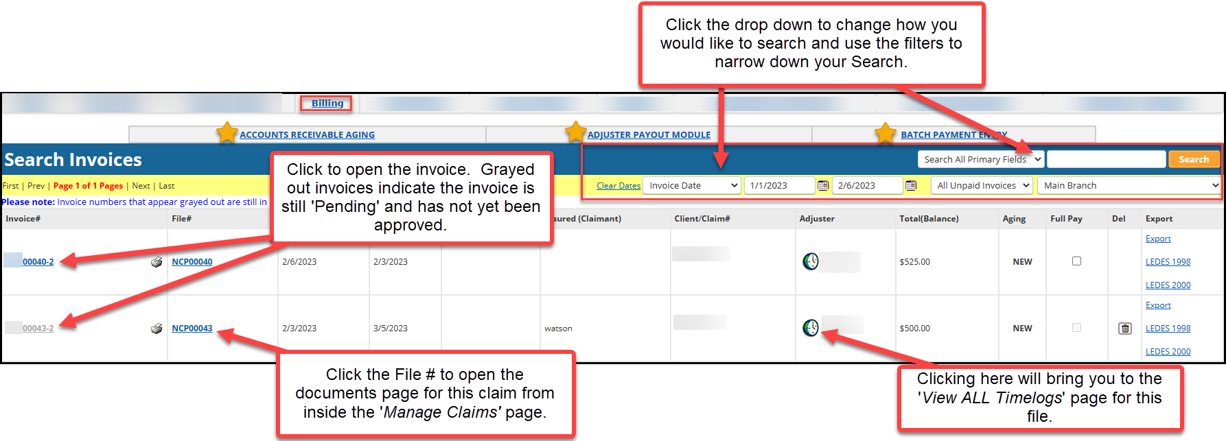 From the Billing page, you can search for invoices using several different search criteria and also access other pages for that file.