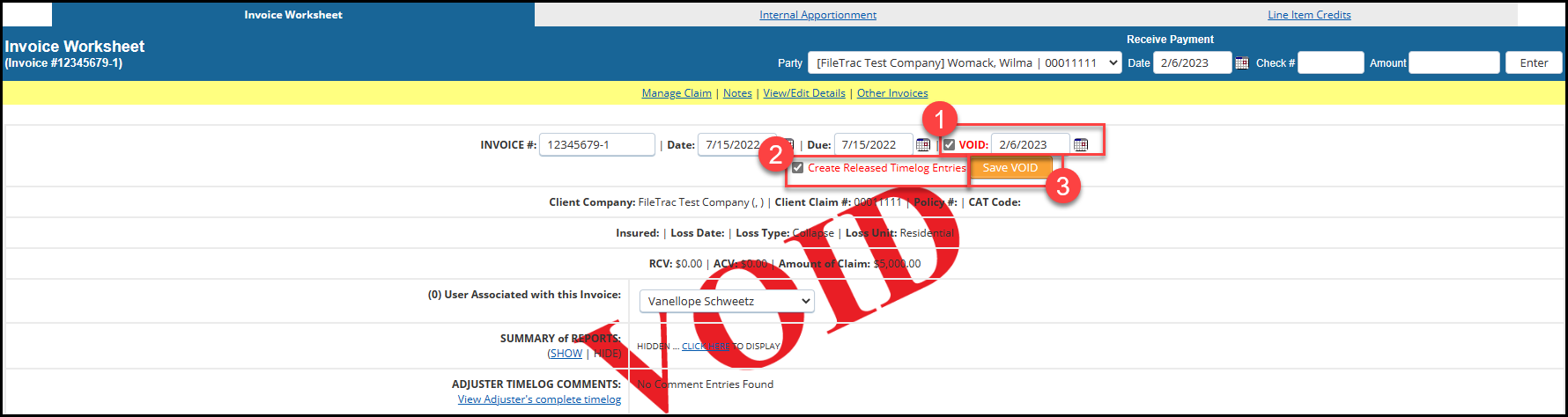 *IMPORTANT Note: If payment has already been made to the adjuster on an invoice, FileTrac will not allow you to void the invoice. For this, you will need to apply a Line Item Credit if an adjustment needs to be made for charges to be removed from the invoice. (See 'Line Item Credits' in Section VI below.)