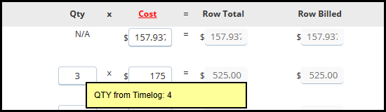 You can hover over the individual Qty and Fee entries on each line item of the Invoice Worksheet to see which ones hold a different value in the Timelog.