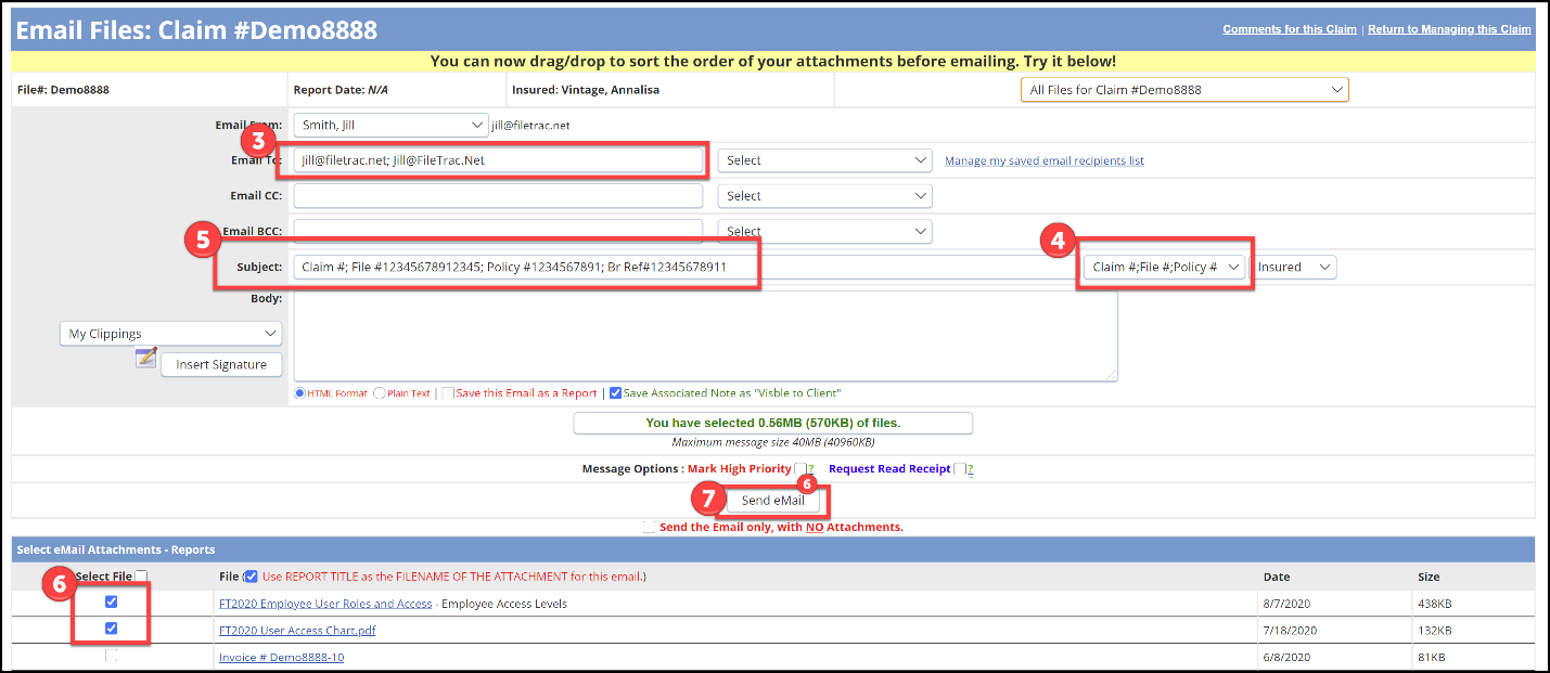 FileTrac has several different options to email documents from within a file and notes. Documents can be emailed from either the Manage Claims page or with the Uploads page and Notes and Documents can be combined in one email from the Notes page. To take advantage of these shortcuts the documents must first be uploaded to the claim. For additional step by step instructions on emailing documents and notes see the instructions below which are followed by instructions on how to upload documents to a file.